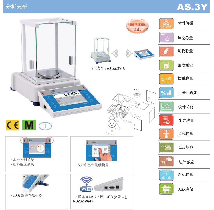 AS.3Y 系列分析天平基于最新的电子模块和最新技术而设计。温度漂移和时间设置触发的内置砝码全自动校准和全自动线性校准,获得精确称量结果。天平配备5.7彩色智能触摸显示屏和最新的Radwag天平操作应用软件。