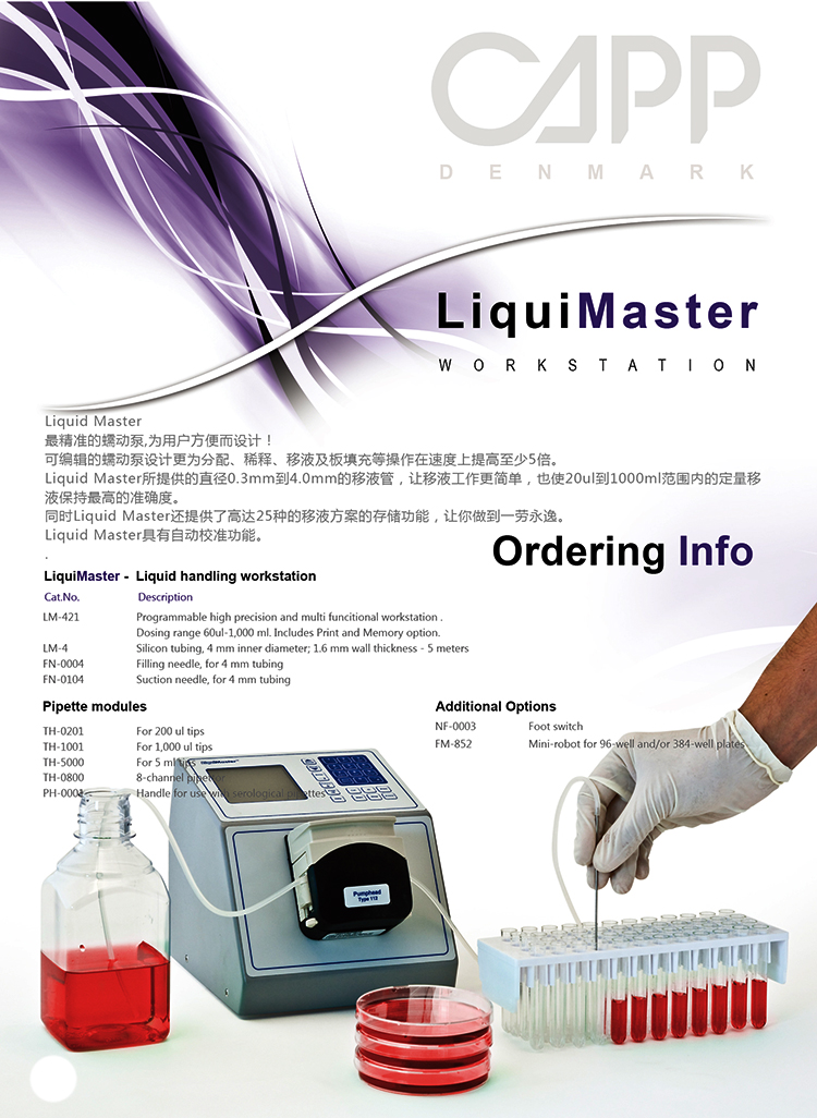 LiquidMaster 为用户使用方便而设计。可编辑的蠕动泵设计更为如分配、稀释、移液及板填充等操作速度上提高高达五倍。 LiquidMaster 所提供的直径为0.3MM到4MM的移液管,让移液更简单,也使20UL到1000ML范围的定量移液保持高准确度。