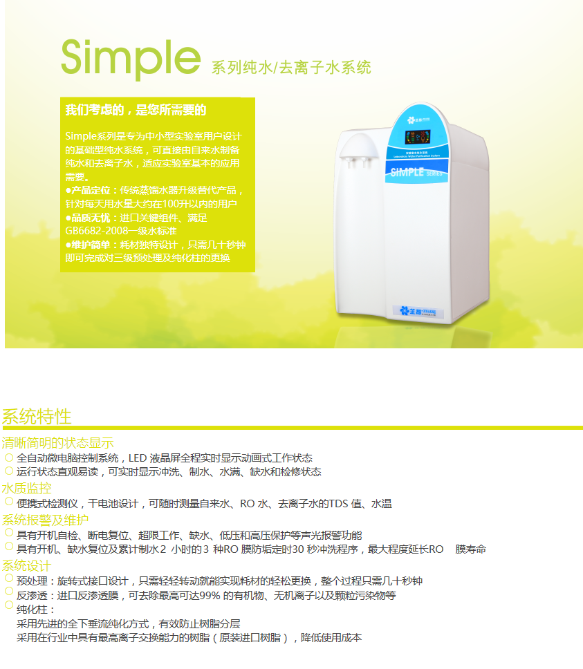 该系统由城市自来水作进水,利用多级别过滤(三级预处理组件、反渗透膜组件)制作出实验室普通纯水。可应用于超纯水系统进水、玻璃器皿清洗/冲洗、微生物分析、样品稀释和试剂制备等对水质要求不高的领域