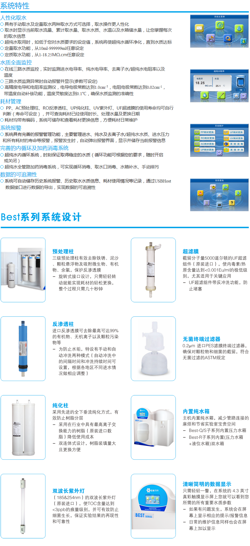 该系统由城市自来水作进水,利用多级别过滤(三级预处理组件、反渗透膜组件、离子交换组件)制作出实验室超纯水,水质标准达到并优于中国实验室用水规格GB6682的一级水标准。可应用于微生物培养基的配制、缓冲液配制、水栽法、制备化学和生化试剂、火焰法原子吸收、实验室设备的供水等